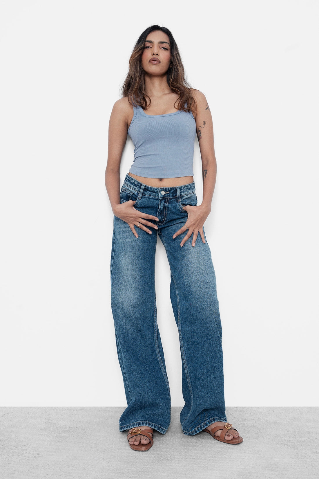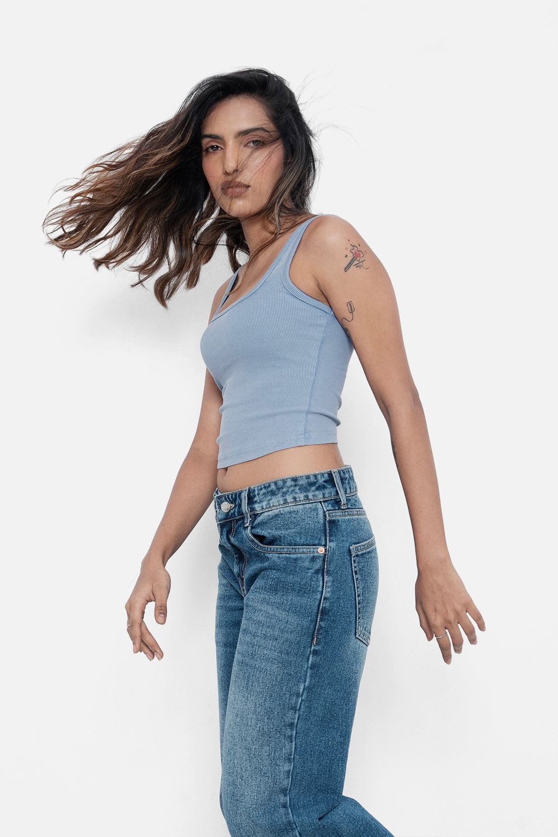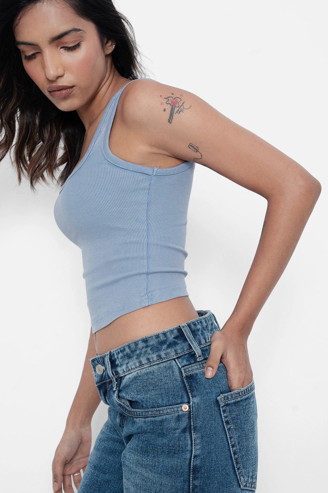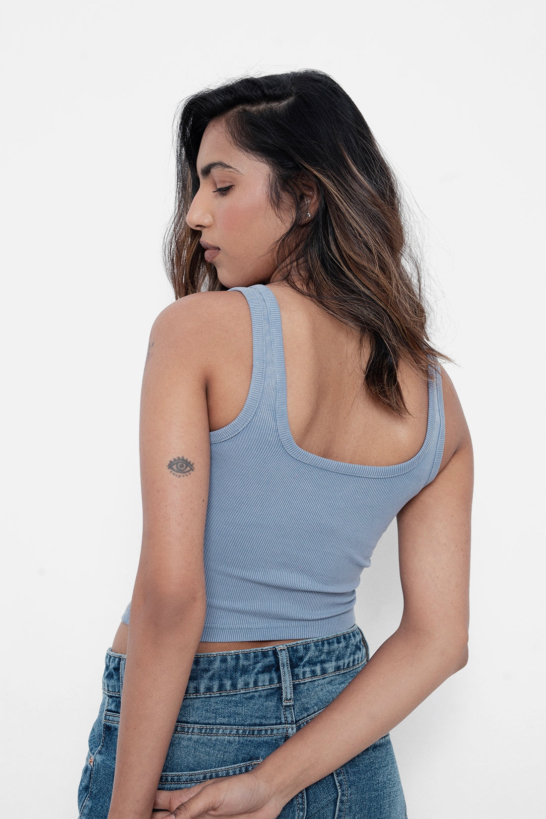 Ribbed tank top with a subtle wash, a fitted silhouette with a square neckline.