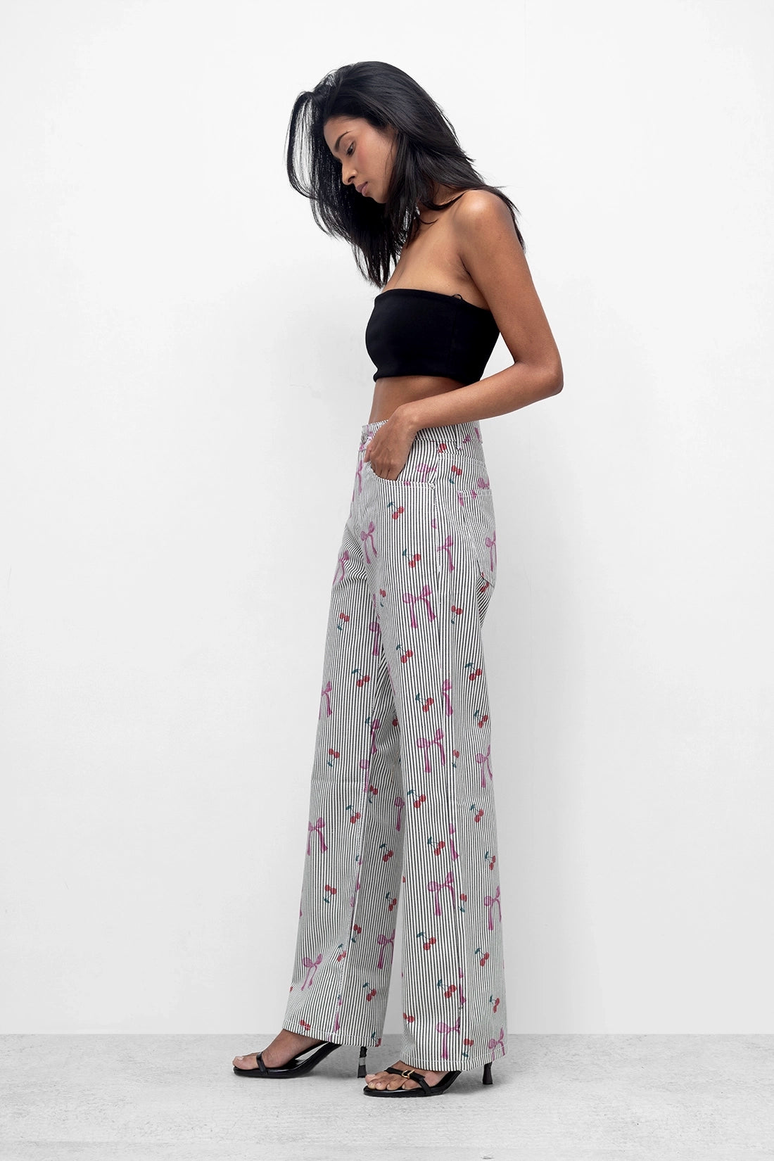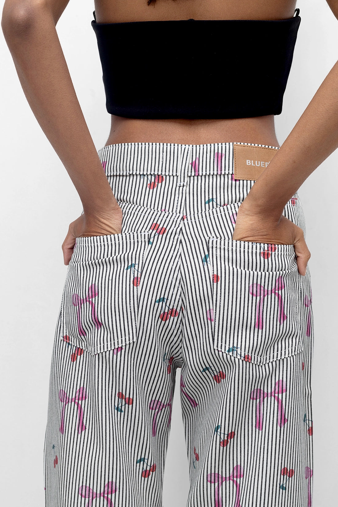 High-waist straight fit pants featuring vertical stripes with playful bow and cherry prints, classic five-pocket design, and a zip fly with button closure.