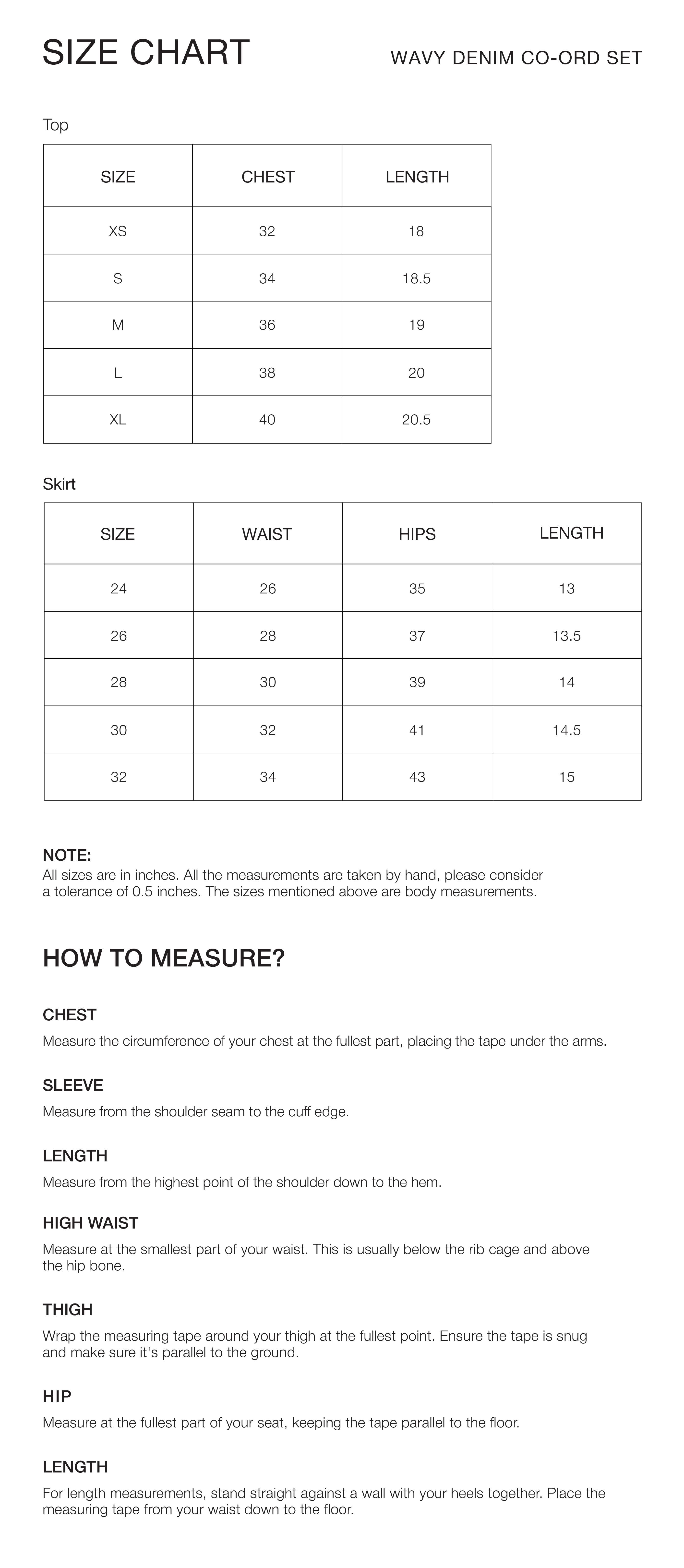 Bottom: High-waisted denim mini skirt with a matching wavy pattern, belt loops, and a button closure with a belt for a fitted silhouette.